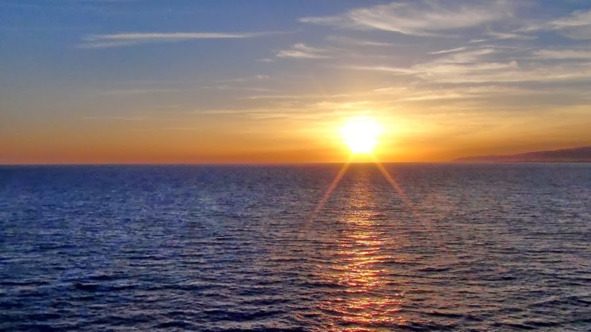 Спустя всего полчаса солнце начинает медленно прятаться за гладь Средиземного моря. Первый круизный закат. Море удивительно тихое, спокойное. Ура, трансатлантический круиз стартовал!