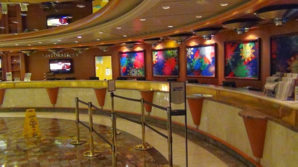 Вот здесь располагается администрация корабля. Решаются бытовые и финансовые вопросы. В самый первый день я положил на свою корабельную карточку 500 долларов. Потому как с пассажиров автоматом высчитывают чаевые – по 12 долларов с человека в сутки. 24 с каюты, 312 за весь рейс. Этой карточкой вы открываете дверь в свою каюту, расплачиваетесь в баре за пиво и коктейли, фиксируете свой сход на берег и возвращение. В своей каюте вы можете на экране телевизора увидеть все расходы, сколько осталось на вашем счету денег. В любое время дня и ночи. Очень удобно.
