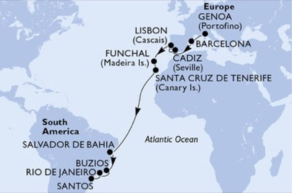 И вот, наконец, получилось. Через круизного агента Алекса (да продлятся его годы и взрастут числа клиентов), мы купили путешествие в Бразилию на новом лайнере MSC Seaview. В принятии решения сыграли сразу несколько факторов: были в инаугурационном круизе этого судна в начале июня и там нам очень понравилось; стоимость этого далекого заплыва была всего 2000 долларов на двоих, и после бронирования внутренней каюты Алекс вскоре сообщил радостную весть – проапгрейдили до балкона! К тому же авиабилеты домой были 1200 долларов на двоих, в отличие от 2014 года, когда они стоили 2000. И самый главный фактор – годы, так скать, поджимают, и вскоре, возможно, уже трудно будет выдержать такой дальний вояж. За 12500 километров от дома. Москва – Игуасу (там, где знаменитые водопады). Чтобы вы представили это расстояние, скажу, что расстояние от Москвы до австралийского Перта 12400 км.