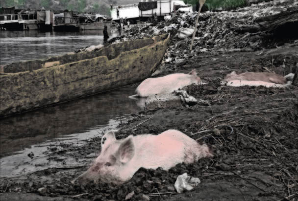 Die Säue fühlen sich wohl im Hafen von Kikwit. Ausgenommen die eine, die uns Gesellschaft leistet. Aber der ist schon alles wurst: Sie dreht sich seit sechs Stunden am Bratspieß von Monsieur Maisha. Monsieur Maisha ist Libanese und führt das einzige Restaurant von Kikwit, das diesen Namen verdient. Er hat sogar drei Gerichte zur Auswahl. Neben Schwein serviert er auch Fisch und Huhn.