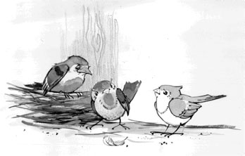 – Добыча! Добыча! – чирикнул отец, и вся семья весёлой стайкой слетела на землю.