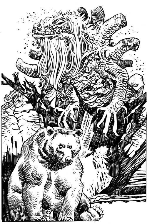 А тем временем медведь-воевода подтянул жировые складки да и припустил во всю медвежью припрыжку в дальний соснячок. Рыканул там что-то на своём наречии – сосны в ответ раздвинулись, и показалась средь них огромная змеиная башка с мохнатыми, непричёсанными бровками.