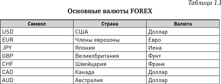 КАКИЕ ВАЛЮТЫ ТОРГУЮТСЯ?В теории любая валюта, выпускаемая существующим государством, может торговаться относительно любой другой валюты. На практике же на рынке доминирует объем торгов основными валютами (см. табл. 1.1). Если расположить их в порядке уменьшения объема торгов (в скобках указаны символы), то это доллар США (USD), евродоллар (EUR), японская иена (JPY), британский фунт стерлингов (GBP), швейцарский франк (CHF), канадский доллар (CAD) и австралийский доллар (AUD). Все остальные валюты называются второстепенными, а происходящие из небольших стран – экзотическими. Новозеландский доллар (NZD) часто включается в число основных валют. Китайский юань является единственной валютой крупной экономической державы, не представленной сегодня на межбанковском рынке. Китайцы извлекают из этого для себя большую выгоду, но у всякого явления есть инь и янь…