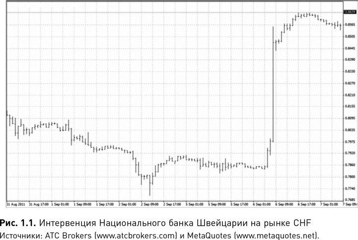 КАК ОПРЕДЕЛЯЮТСЯ ЦЕНЫ ВАЛЮТ?На цены валют влияет огромное количество постоянно меняющихся экономических и политических условий, но, вероятно, самыми важными являются процентные ставки, государственные интервенции, экономические условия, международная торговля, инфляция или дефляция, политическая стабильность и, в некоторых случаях, вооруженный конфликт. Правительства иногда реально участвуют в работе валютного рынка – выбрасывая на рынок свою национальную валюту в попытке понизить ее курс или, наоборот, покупая ее с целью курс повысить. Процесс этот известен как интервенция центрального банка и может привести к значительному, хотя нередко и краткосрочному, движению соответствующей валюты. Взгляните для примера на график USDCHF, показанный на рис. 1.1. Менее чем за один час цена взлетела на 500 пипсов.