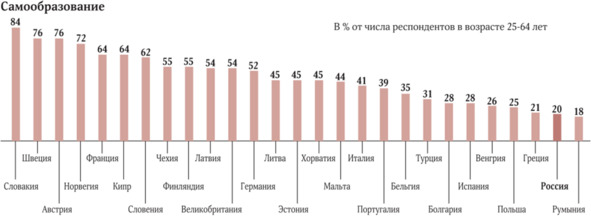 Чаще всего недавний студент становится сотрудником компании и его образование продолжается в лучшем случае на корпоративных тренингах. Но даже это хорошо. Ведь у других оно попросту останавливается. К сожалению, рейтинг самообразования в России невысок2.