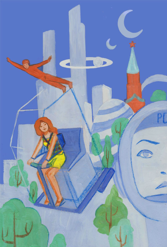 «А теперь – нажми на красную кнопку на руле и, удерживая её, сосчитай до 5. Ты взлетишь на высоту примерно 2,5–3 метра, выше не получится, это максимальная высота полёта. Управляй руками и ногами, руль можно поворачивать вправо-влево, регулировать скорость нужно ногами: если слегка нажать носком правой или левой ноги на подножку, то скорость увеличится, а нажимая пяткой любой ноги на подножку, ты скорость снижаешь. Чтобы зависнуть в воздухе и остановиться, нужно обеими ногами надавить на подножку. Чтобы спуститься вниз – снова нажимаешь кнопку на руле и держишь её, считая до 10. Я полечу рядом, буду тебя сопровождать. Мы с тобой сделаем круг над Москвой и вернёмся обратно. Когда взлетишь, то увидишь указатели, которые обозначают дорогу именно для гиролётов, для них выделена специальная воздушная трасса, с которой нельзя сходить, чтобы не стать участником аварии. Не переживай, этот вид транспорта полностью надёжен. И к тому же, на тебе страховочный костюм и ремень, на котором расположена подушка безопасности. Ну, что, готова к полету? Если да, то пробуй взлететь!