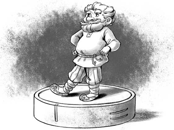 По бежевому ковру ползает-трудится робот. А на нём… а на нём разъезжает, отталкиваясь одной ногой, крохотный бородатый старичок!
