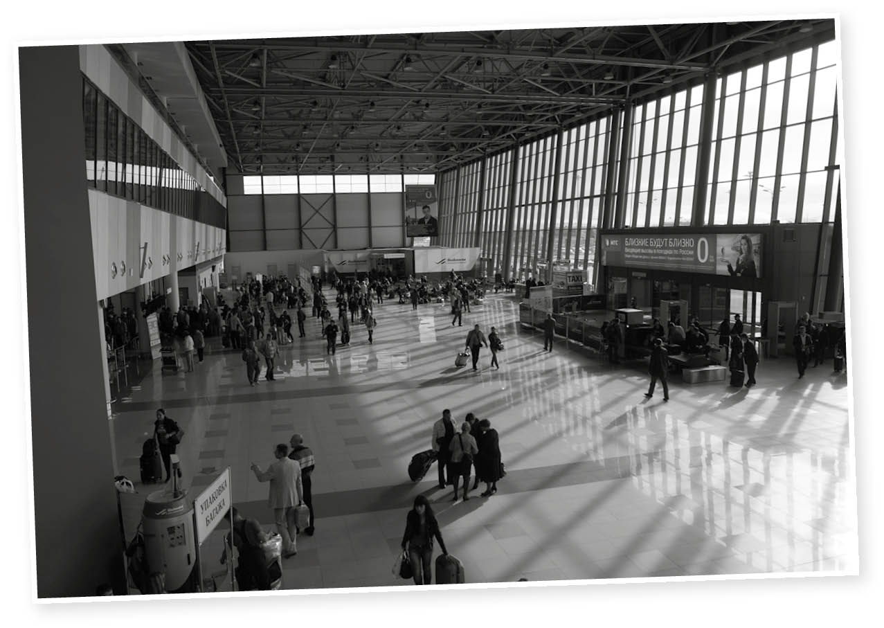 Zwischenlandung in Moskau. Ich bin bei schönstem Sonnenschein in Berlin losgeflogen, hier ist es kalt und es regnet in Strömen. Ich habe ein paar Stunden Zeit. Auf dem Flughafen kann ich ins Internet, überall offene Netzwerke. Eine Leni Schwarz aus Stuttgart hat mir geschrieben und den Kontakt zu einer Irina hergestellt. Sie sind alle irgendwie mit Kunst & Albers verbunden, jedoch weiß ich noch nicht wie. Ich antworte allen und maile munter weiter, bis mein Anschlussflug aufgerufen wird.