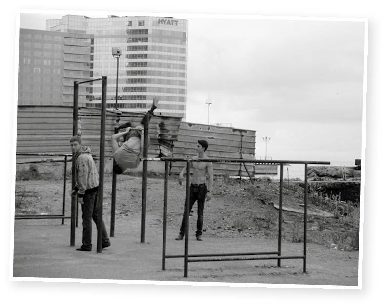 Körperkult und Fitnesswahn gibt es nicht nur in L.A. Nur stören die hiesigen Baustellenzäune und Wellblechbuden das Bild etwas.