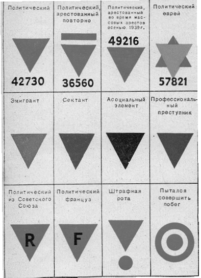 Нашивки-винкели, которые носили заключенные концлагерей. Заключенные-иностранцы носили на «треугольниках» буквы, обозначавшие их национальность, например, итальянцы – I (Italien), голландцы – N (Niederlande), поляки – P (Polen), чехи – T (Tschechoslovarei), советские военнопленные – SU (Sowjetunion).