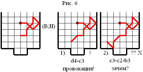 В этих партиях менее опытный игрок (он играл за Нижние ворота (Н)) постоянно зацикливался на каких-либо своих «принципах» игры: он то безудержно атаковал и его загоняли в ловушку с помощью «схем» или «танца у ворот», то пассивно «жался» на стороне своих ворот и его «ловили» на модель. Интересна также партия, в которой более слабый игрок (он играл за Верхние ворота (В)) зациклился на идее «схем» и в результате его «поймали» на модель34.