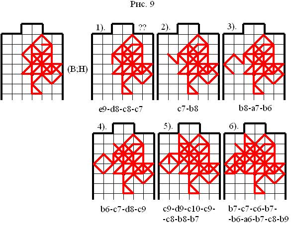 Из конструкции, представленной на рисунке 9, первый ход делает Верхний игрок (В). Он думал, что этим ходом создал себе безопасное положение – модель № 3 – ДАЛЬНЯЯ ОБМАНКА36, потому что конструкция 1). внешне похожа на данную модель. Верхний игрок (В) зациклился на модели № 3 – ДАЛЬНЯЯ ОБМАНКА и не учёл, что пересечение с6 – занято, в отличие от модели № 3 – ДАЛЬНЯЯ ОБМАНКА, где оно было пустым. В итоге 5). ходом Верхний игрок (В) не построил чётный выход в свою пользу и Нижний игрок (Н) с помощью перекрытия хода создал Верхнему игроку (В) безвыходное положение. Верхнему игроку (В) необходимо было увидеть, что в данной конструкции нельзя реализовать идею модели № 3 – ДАЛЬНЯЯ ОБМАНКА и сходить так (рисунок 10):