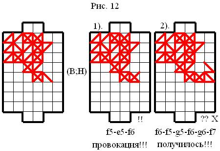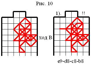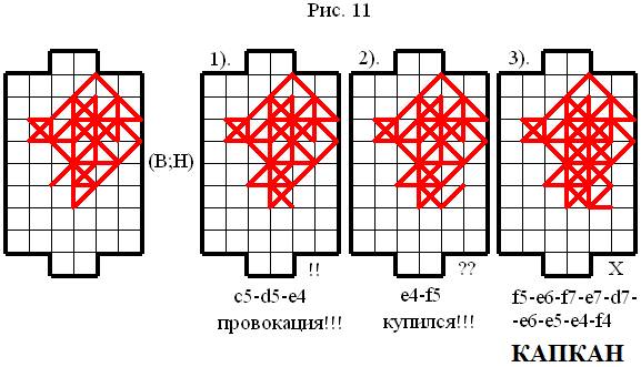 Из конструкции, представленной на рисунке 11, видно, что Верхний игрок (В) прекрасно закрепился в поле и построил наивыгоднейшую опорную конструкцию. При этом Верхний игрок (В) подметил, что есть шанс выиграть эту партию без долгой обработки опорной конструкции, он понял, что если он сходит: c5-d5-e4 – то возможно ему удастся поймать Нижнего игрока (Н) на модель № 10 – КАПКАН37. Как видно из рисунка 11 – всё прошло по задумке Верхнего игрока (В): Нижний игрок (Н) пассивно сходил – e4-f5, после чего Верхний игрок (В) реализовал идею модели № 10 – КАПКАН. Очень здорово, когда в партии удаются такие фокусы!