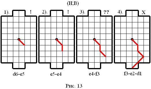 В партии, представленной на рисунке 13, первый ход сделал Нижний игрок (Н) – это ход в сторону его ворот. Своим первым ходом Нижний игрок (Н) показал, что не будет «рваться» к воротам соперника, молодец! Верхний игрок (В) тоже «не растерялся» и решил: «Ладно, хочешь – поиграем на стороне твоих ворот!» Верхний игрок (В) сделал ход: e5-e4. По каким-то неведомым причинам (скорее всего непонимание правил игры) Нижний игрок (Н) третьим ходом занял пересечение своей голевой линии! После этого Верхнему игроку (В) оставалось только забить гол, что он и сделал.