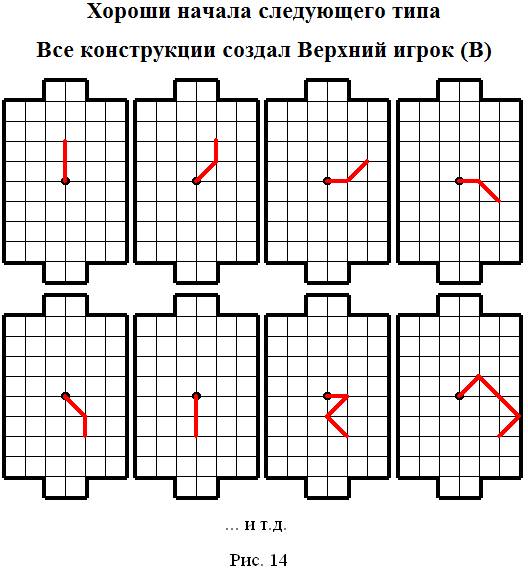 Все конструкции, представленные на рисунке 14, создал Верхний игрок (В). Смысл его ходов прост: он старается сразу спровоцировать соперника на атаку или на «модельную ловлю». Верхний игрок (В) сходил так, что у Нижнего игрока (Н) сразу появилась возможность занять пересечение голевой линии.
