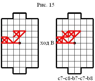 Из конструкции, представленной на рисунке 15 первый ход сделал Верхний игрок (В). Этим очень неплохим ходом Верхний игрок (В) построил выгодную опорную конструкцию – лишил Нижнего игрока (Н) возможности прохода через пересечение c7. Теперь Нижний игрок (Н) вынужден работать у Верхних ворот (В). Но данное положение абсолютно безопасно для Верхнего игрока (В) и он, применяя «танец» у ворот, укрепит своё положение в поле.