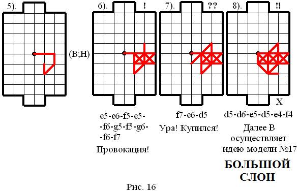 Как видно из рисунка 16, Верхний игрок (В), «не грузясь» шестым ходом в партии построил провокационную плотную конструкцию. Провокация действительно хороша: это одновременно и провокация на атаку (Нижний игрок (Н) может занять f9), и провокация на «модельную ловлю»! Нижний игрок (Н) седьмым ходом «купился» на этот фокус и далее Верхний игрок (В) выигрывает партию, осуществляя идею модели № 17 – БОЛЬШОЙ СЛОН51.