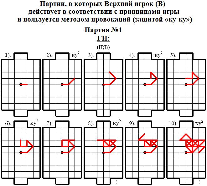 В приведённых ниже партиях на защиту «ку-ку» использование этого метода Верхним игроком (В) будет обозначаться: ку2.