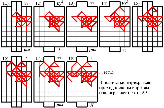 Верхний игрок (В) полностью перекрывает проход к своим воротам и выигрывает партию! Дальше всё идёт по «отработанной схеме»55!