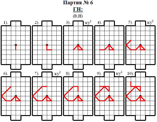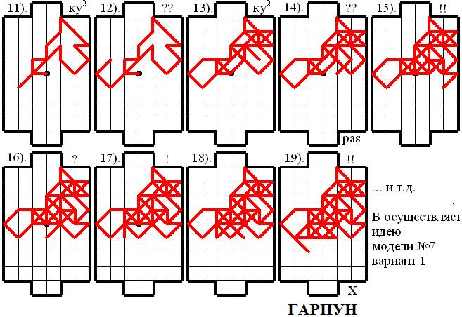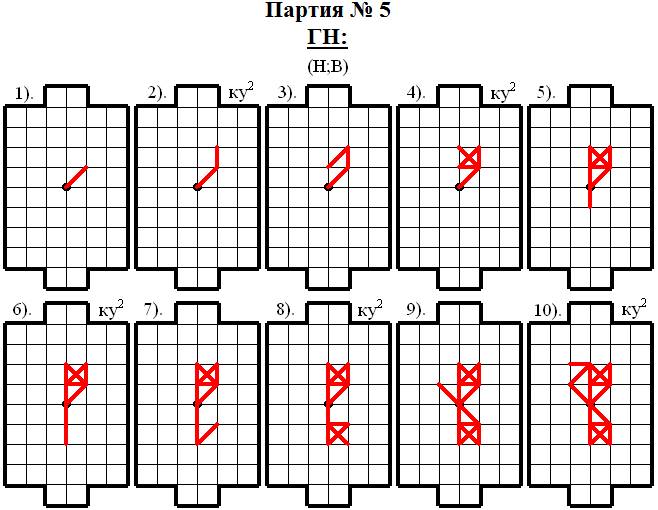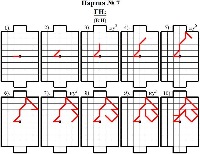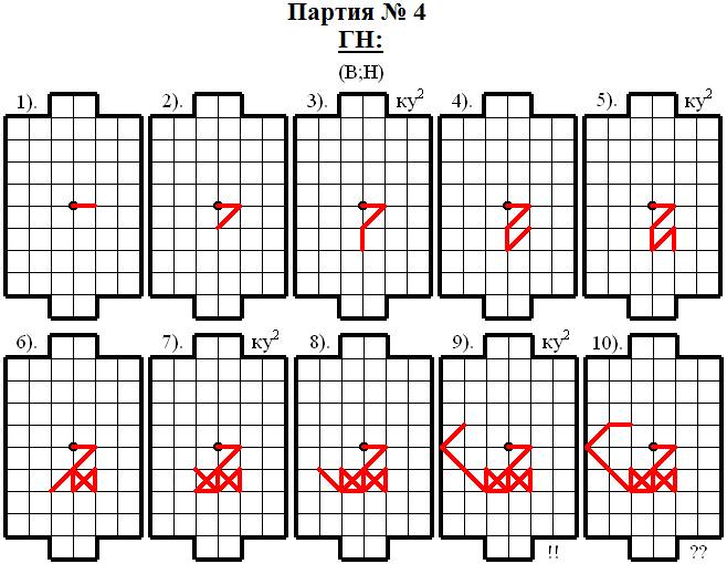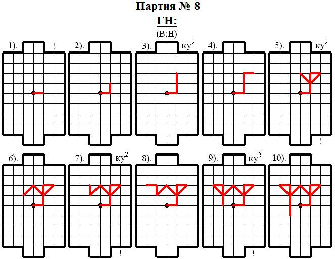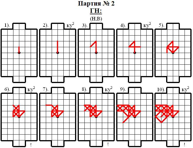 Верхнему игроку (В) сразу удалось спровоцировать соперника на атаку и уже 4 ходом Нижний игрок (Н) занял e9 – одно из пересечений голевой линии соперника. Однако Нижний игрок (Н) оказался «не так то прост» – он начал делать отступления! Но Верхний игрок (В) всё равно оказался хитрее и в результате целой «серии провокаций» ему удалось 15 ходом построить выгодную для себя опорную конструкцию, которую он в дальнейшем грамотно обработал и забил гол в этой партии, осуществив идею модели № 7 – ГАРПУН61.