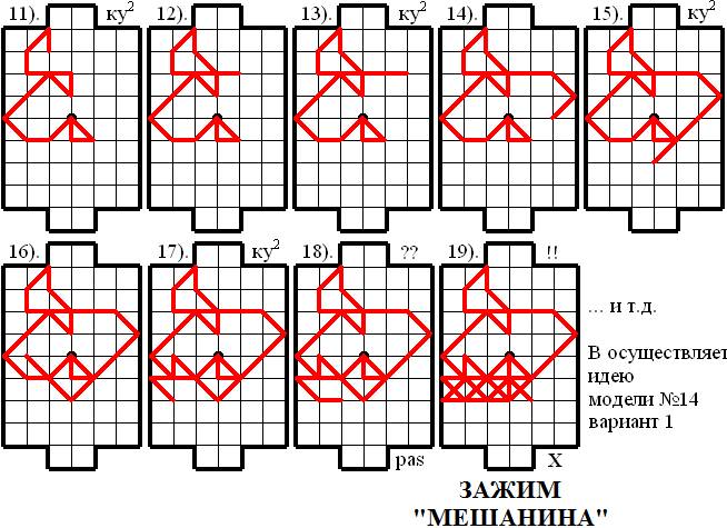 В этой партии защита «ку-ку» снова «не подкачала», хотя Верхнему игроку (В) отчасти повезло: 18 ход Нижнего игрока (Н) очень вял и пассивен, а ведь можно было ещё «побороться»! Но так или иначе Верхнему игроку (В) удалось поймать соперника на модель № 14 – ЗАЖИМ «МЕШАНИНА»60 на 19 ходу!