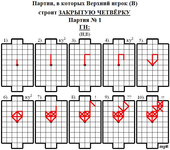 Верхний игрок (В) строит закрытую четвёрку и неплохо закрепляется в поле! К тому же это провокация: есть шанс «поймать» Нижнего игрока (Н) на модель № 10 – КАПКАН.