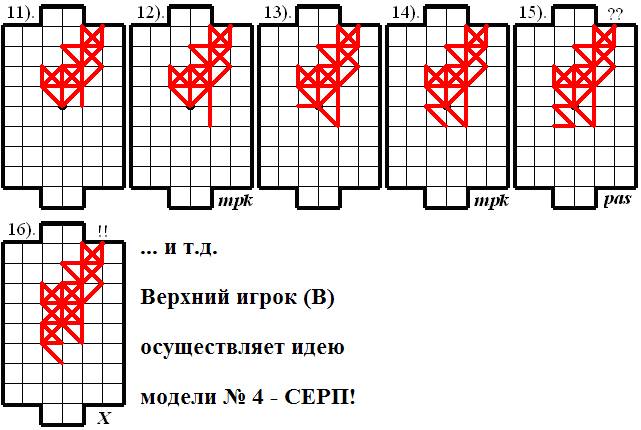 Это была лёгкая партия для Верхнего игрока (В) – он постоянно провоцировал Нижнего игрока (Н) на атаку своих ворот. В результате всех этих провокаций Верхнему игроку (В) удалось на 10 ходу построить закрытую четвёрку64, затем он «дожал» Нижнего игрока (Н), осуществив в итоге идею модели № 4 – СЕРП65.