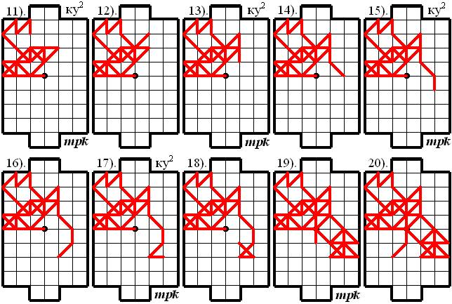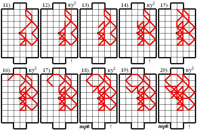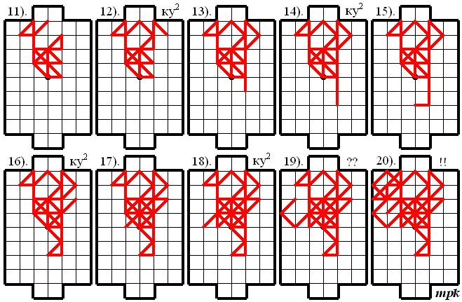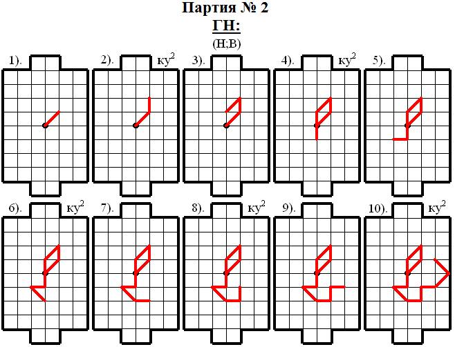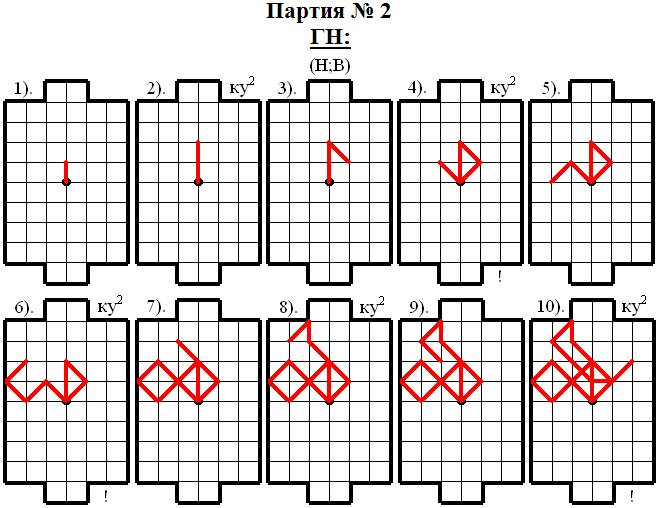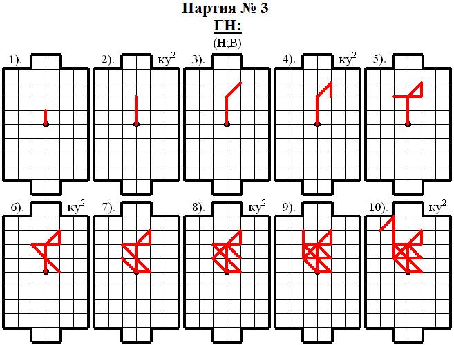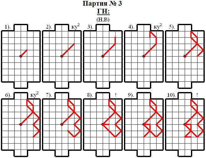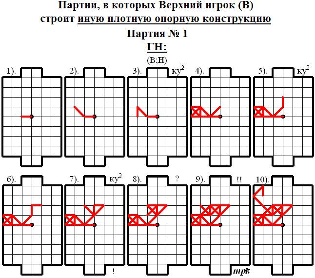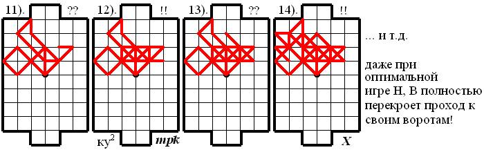 Верхний игрок (В) сразу начал провоцировать соперника на атаку, а 9 ходом осуществил неплохой трюк – построил выгодную опорную конструкцию, принудив Нижнего игрока (Н) работать у Верхних ворот (В)!