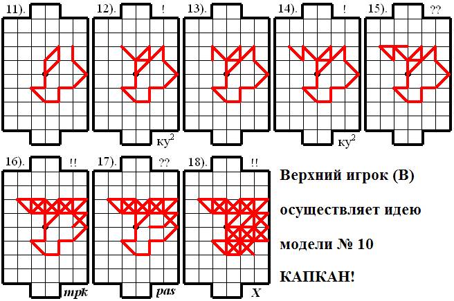 В этой партии Верхний игрок (В) использовал защиту «ку-ку»: он то провоцировал соперника на атаку, то старался «поймать» его на модель. В общем, Верхний игрок (В) постоянно «смещался».