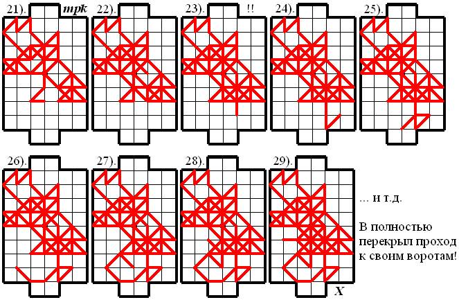 Дальше Верхний игрок (В) «танцевал», «танцевал», «танцевал» возле своих ворот (ходы 11 и 13)!