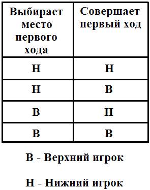 Пример: (В;Н) – означает, что место первого хода выбирает Верхний игрок (В), а совершает первый ход Нижний игрок (Н).