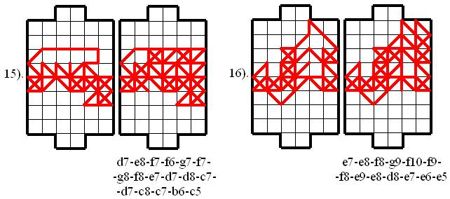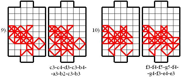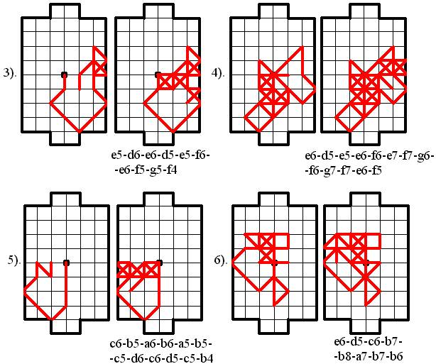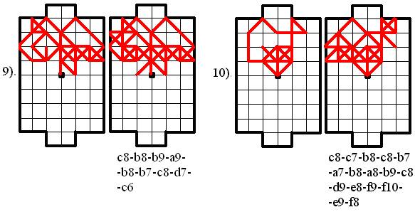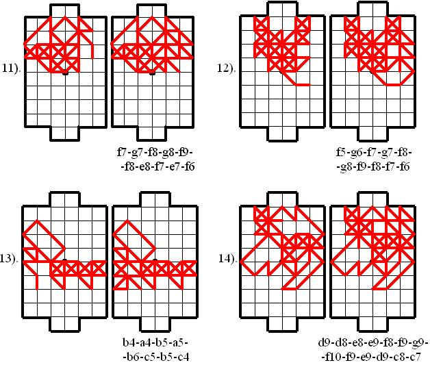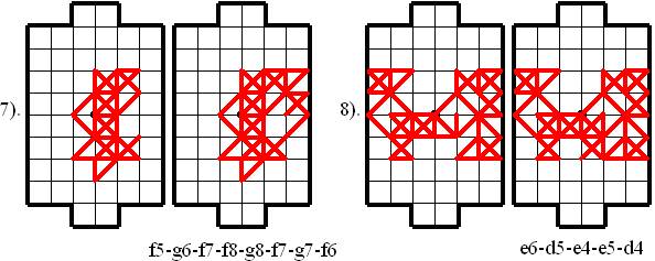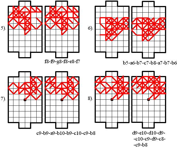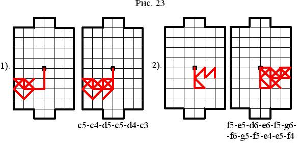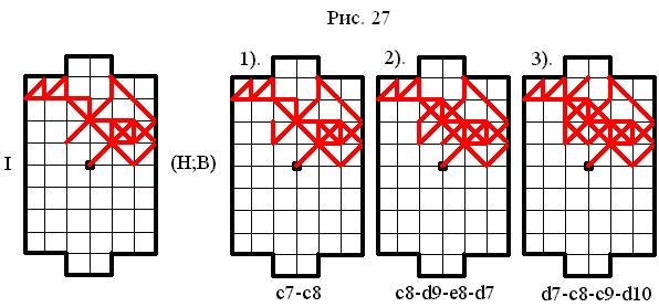 Б). Суть второй модели состоит в следующем: с помощью чётного выхода ты лишаешь противника возможности перекрыть проход к голевым пересечениям, т.е. как бы твой соперник не ходил – следующим ходом ему будет забит гол (если, конечно, он не забьёт гол сам себе или не попадёт в тупик). На рисунке 28 представлены примеры создания этой модели:
