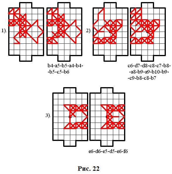 В). Третья модель – это создание с помощью перекрытия хода безвыходного положения у ворот противника. Основная идея данной модели: с помощью перекрытия хода ты создаёшь такую конструкцию, что следующим ходом противник становится в пересечение, из которого ему будет забит гол – голевое пересечение, возможности выйти в безопасное пересечение – у него нет. На рисунке 23 представлены примеры создания таких положений Верхними воротами (В):