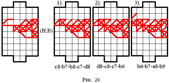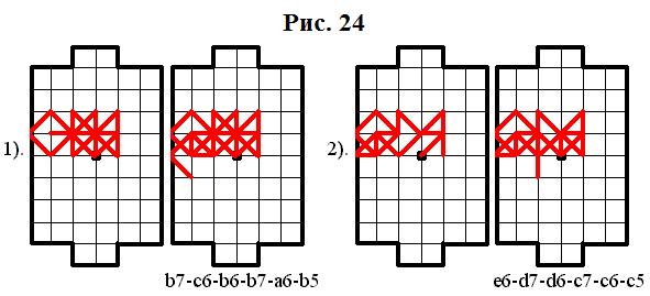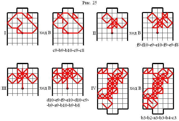 Если тебе удастся построить в поле данную конструкцию – победа в партии тебе гарантирована на 90%. Суть данной модели будет рассмотрена в разделе «Стратегия»2, а сейчас я просто продемонстрирую, как её создать с помощью перекрытия хода. На рисунке 24 приведены примеры построения закрытых четвёрок Верхними воротами (В):