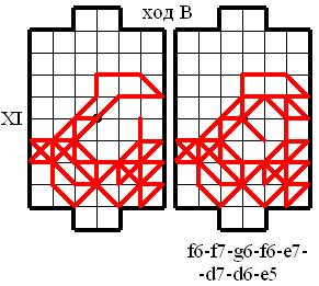 Нижние ворота (Н) своим первым ходом создали конструкцию – чётный выход. У Верхних ворот (В) есть две альтернативы – занять одно из пересечений: b9-…-f9, тогда им будет забит гол, или пересечение b6, что они и делают вторым ходом. Третьим ходом Нижние ворота (Н) полностью перекрывают проход и, следовательно, побеждают в партии.
