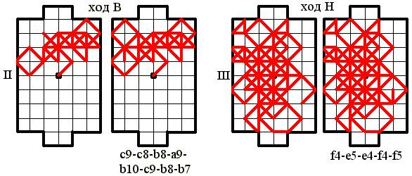 В примере II Верхние ворота (В) не только спаслись от поражения, но и заняли наивыгоднейшее положение. Если Нижние ворота (Н) и дальше будут «рваться вперёд» и выйдут в пересечение b9, то защищающаяся сторона вообще полностью перекроет проход к своим воротам и выиграет партию.