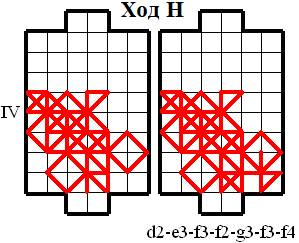 На рисунке 31 показан пример создания безвыходного положения на стороне ворот Нижнего игрока (Н). Из рисунка видно, что Нижний игрок (Н) может следующим ходом занять одно из следующих пересечений: (b3; c3; d2; d5; e3; f3). После занятия Нижним игроком (Н) одного из этих пересечений – ему забивается гол, поскольку все эти пересечения являются голевыми.