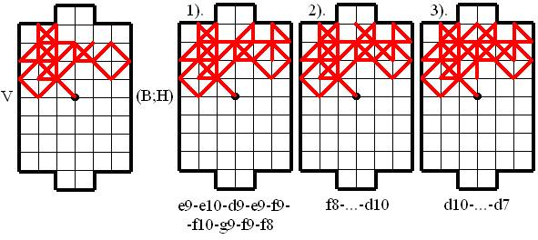 В примере I (рис. 29) защищаются Верхние ворота (В). Первый вариант – оптимальный (ход 1).1), Верхние ворота (В) создали ситуацию чётного выхода и если Нижние (Н) решат продолжить атаку и выйдут в пересечение е9 – следующим ходом защищающаяся сторона полностью перекроет проход к своим воротам и следовательно выиграет партию. Во втором варианте Верхние ворота (В) поторопились и следующим ходом атакующая сторона (Нижние ворота (Н) перекрытием хода полностью закрывает проход к своим воротам (ход 2).2). Данный пример – иллюстрация хорошей и плохой защиты.