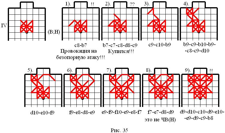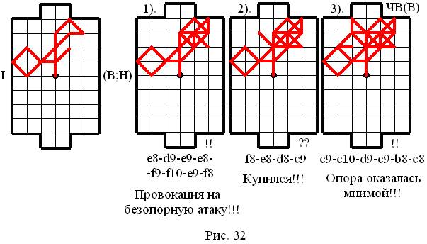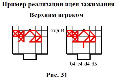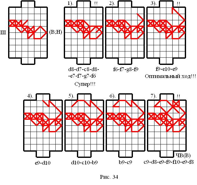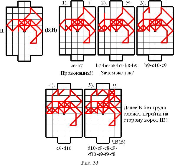 Из конструкции, представленной на рисунке 34 первый ход сделал Верхний игрок (В) – этим ходом он создал безопасное положение на стороне своих ворот и спровоцировал Нижнего игрока (Н) на безопорную атаку! Нижний игрок (Н) решил атаковать, а зря! Несмотря на то, что Нижний игрок (Н) атаковал оптимально – ему не удалось осуществить идею зажимания, т.к. опора оказалась мнимой, а Верхний игрок (В) оптимально защищался! В результате Верхний игрок (В) построил 7). ходом чётный выход в свою пользу и «без труда» сможет перейти на сторону ворот Нижнего игрока (Н)!