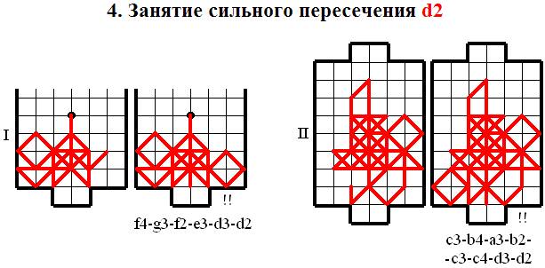 Игровая задумка: вынудить Нижнего игрока (Н) занять пересечение d7 (сделать это можно с помощью выхода в b4), а затем с помощью перекрытия хода осуществить идею модели полное перекрытие прохода к своим воротам6.