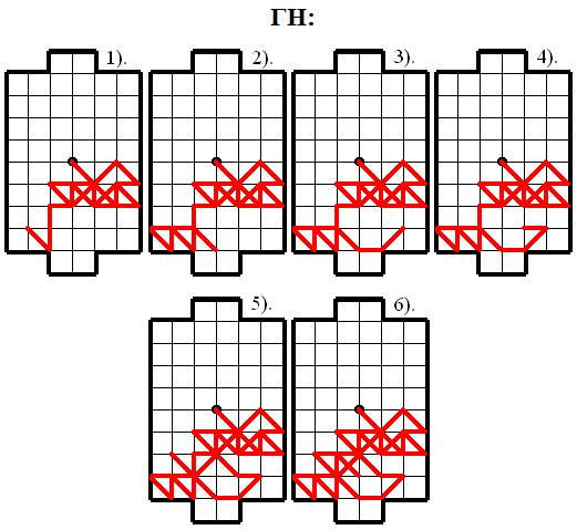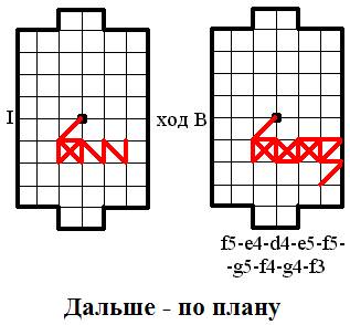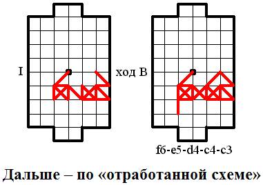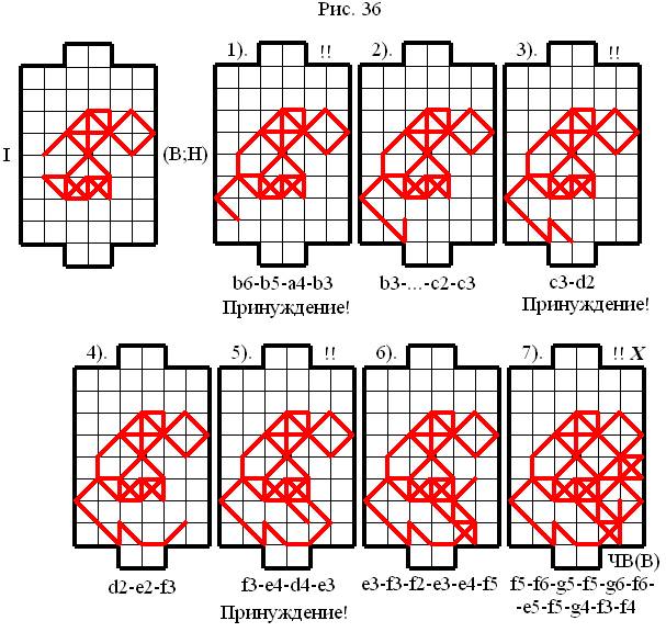 2)-4). – заполнение пустых пересечений (f6, f5, f4), т.к. их количество нечётно, то в последнем остановятся Нижние ворота (Н). После этого Верхние ворота (В) следующим ходом занимают пересечение f3 или e3 и становится очевидным, что Нижние ворота (Н) в западне.