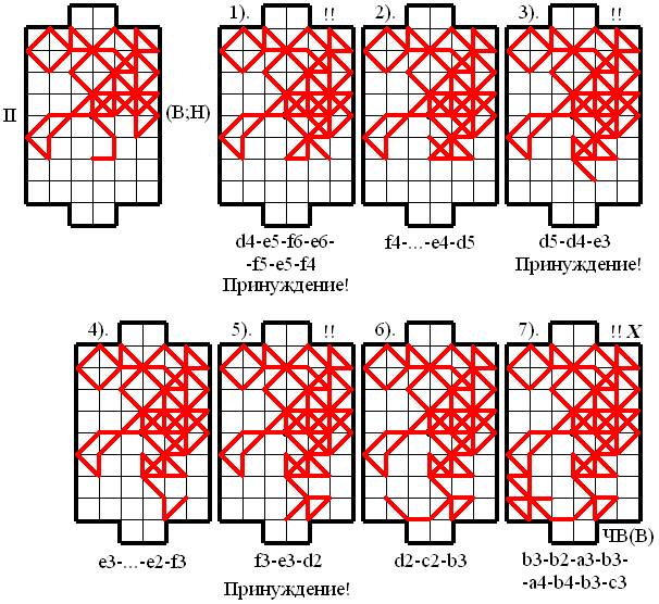 2). f7-e6-f5 (в сложной ситуации Нижние ворота (Н) не растерялись и ухватились за последний шанс – возможность выиграть тупиком)