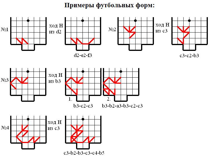 Игровая задумка: вынудить Нижнего игрока (Н) занять пересечение b3 (с помощью формы №2), а затем с помощью перекрытия хода сделать так, чтобы соперник мог занять только голевое пересечение (d3 или d2).