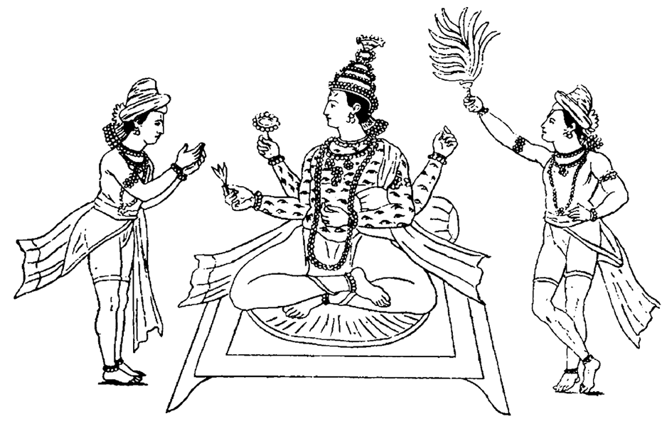 Сам он избрал дворец Пушкамарамалини, где восседал на троне под белым опахалом со своей супругой Шачи в окружении божеств бури и грома марутов, риши и сонма богов. Его слух услаждали песнями и танцами апсары.