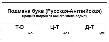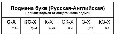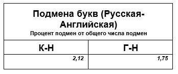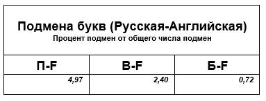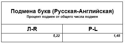 Казалось бы, и у английской «P» должны быть свои товарищи, кроме русской буквы «Б». Но их практически нет. Есть сочетание Р-P, но оно ниже уровня погрешности в 0,5% от всех подмен. Такие примеры есть в словаре, но в этом повествовании я решил их не освещать, чтобы не засорять лишней информацией вам голову.