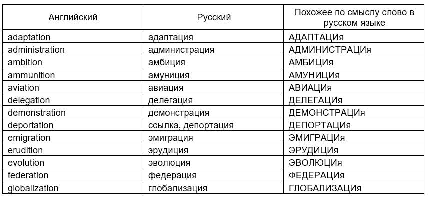 Если мы видим слово с английским окончанием «TION», значит в русском языке есть это слово с окончанием на «ЦИЯ». И наоборот.