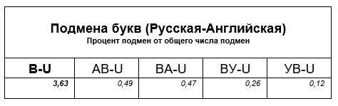 На втором месте после русской буквы «П», по частоте подмен находится русская буква «В»: