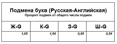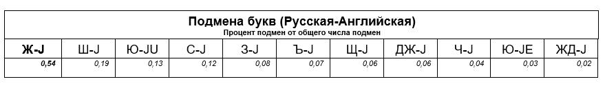 Жирным шрифтом я выделил подмены, процент которых, от общего количества всех подмен в словаре, больше 0,5.