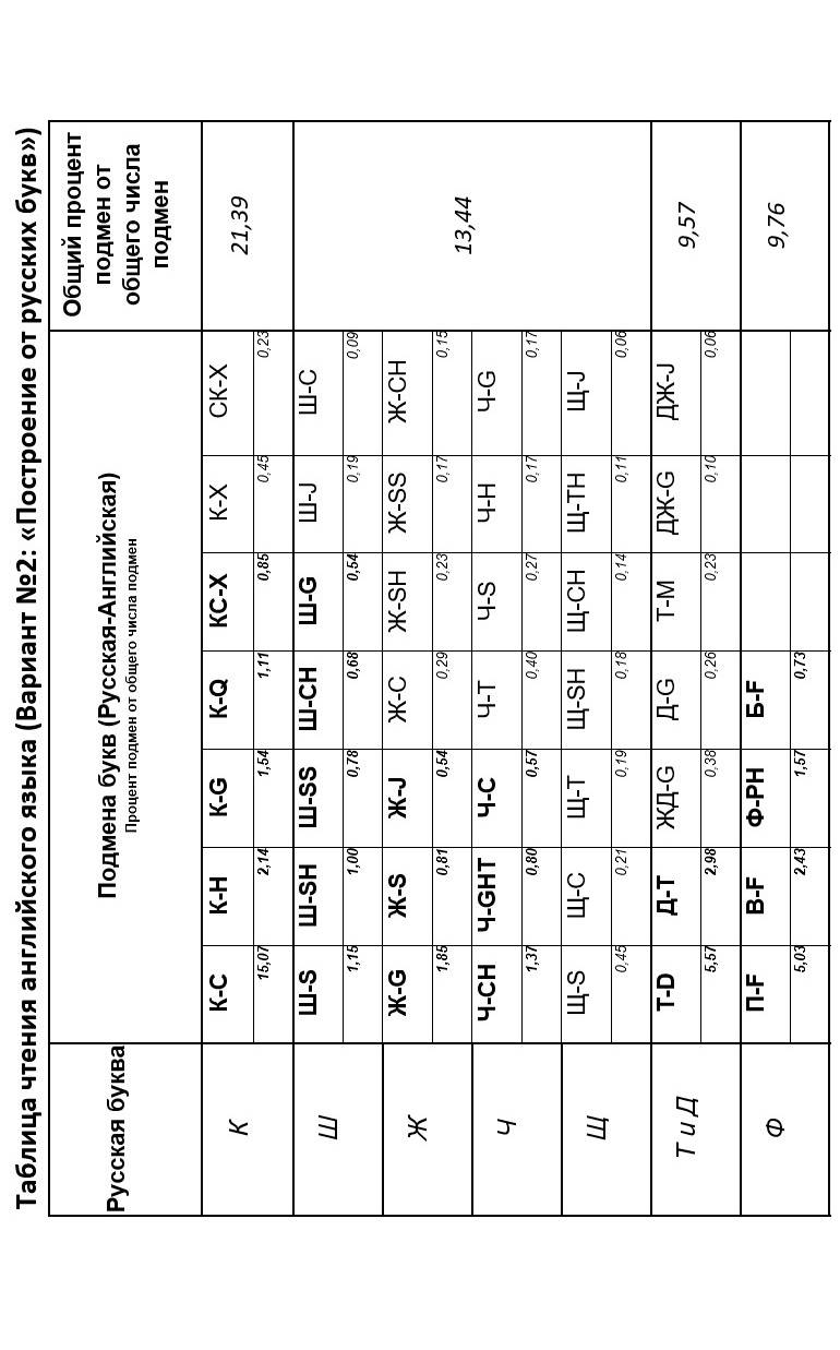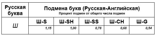 Посмотрите, пожалуйста, ещё раз на таблицу. Чем дальше от левого (наиболее повторяющегося) значения таблицы, тем вероятнее английские буквы «C», «T», «S», «G», «H», «J», по отдельности или образуя сочетания, склоняются к выражению шипящих русских букв «Ш», «Ж», «Ч», «Щ».