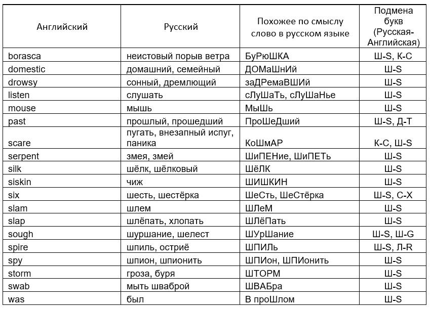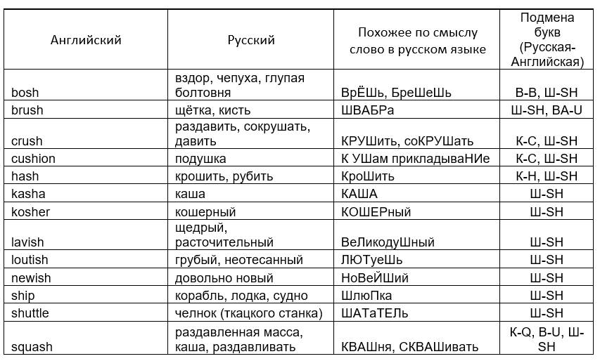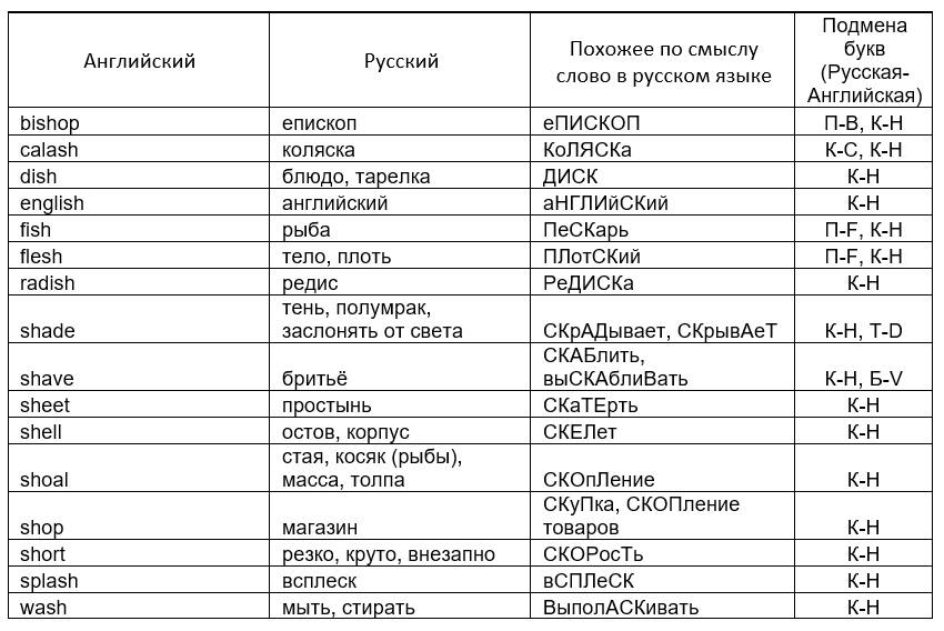 Казалось бы, в чём тут подвох? Пусть будет «SH» равняться букве «Ш». Нет проблем. Есть! А дело в том, что, по-видимому, было время, когда английскими буквами «SH» англичане старались передать звук похожий на русские «СК». Но, в какой-то, поистине фатальный, момент истории, англоговорящие решили произносить как звук «Ш» все сочетания английских букв «SH». С тех пор носители английского языка навсегда утратили смысл целой группы слов! Смотрите: